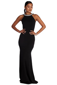 Glamorous, elegant, and timeless perfectly describe the Brookelle satin formal dress with a unique pleated keyhole halter neckline and a striking applique sequin bodice.