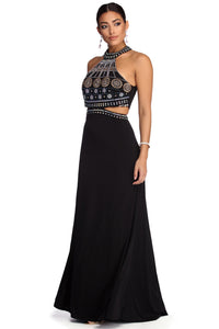 Special OccasionBring the glamour to your evening in our Queen-worthy Zariyah dress! She features a chic black hue, a high round neckline with racer bust and padded cups. Her bodice is adorned with sparkling heat stones with gemstones and sexy waist cut outs for a pop of skin! Her slim fit bodice leads to an elongating floor length silhouette with flared hem. Dress is composed of a lined smooth knit fabric that offers a form hugging fit with a moderate stretch.