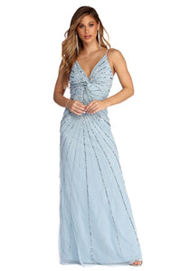 Special OccasionShine like the firework you are in our dazzling Lucinda light blue dress! She features a sleeveless bodice, a V neckline with a knot accent and narrow adjustable straps. Her relaxed fit bodice leads to an elongating floor length silhouette. Lucinda is composed of a lined mesh fabric adorned with silver sequins to light up the night! Dress offers a relaxed fit with minimal stretch. Includes a back zipper closure.