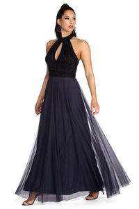 Special OccasionMake it a magical moment in our captivating Francesca black dress! She features a high round neckline with racer bust, small keyhole and padded cups. Her bodice features a beaded design set in dazzling geometric pattern. Her slim fit bodice leads to a navy hued floor length silhouette that brings elegance to the evening. Dress is composed of a combination mesh, tulle and a smooth knit fabric that offers a form hugging fit with minimal stretch. Includes a hidden back zipper closure.