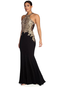 Special OccasionMake it a metallic moment as you twirl the night away in our dazzling Dina black dress! She features a high round neckline with a double hook fasten at the nape of the neck, padded cups and a bold open back with a triple row fish hook clasp closure. Her bodice features a gold hued metallic floral applique accent and twinkling heat stones. Her floor length skirt features a curve hugging fit with vertical seams and a flared hem. Dress offers a moderate stretch. Includes a hidden lower back zipper closure.