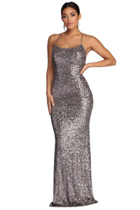 Special OccasionMake it a moment to remember in the spotlight as you sparkle in our Chrissy gray dress! She features a sleeveless bodice, a scoop neckline with padded cups and narrow straps that lead to a sexy open back with lattice design. Her slim fit bodice leads to an elongating floor length silhouette. Dress is composed of a lined mesh fabric adorned with sequins throughout. Dress offers a form hugging fit with a moderate stretch.