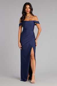 Effortless sophistication, redefined. The Evelyn formal dress moves with sleek confidence in soft, sculpting knit that hugs every curve. With its off-the-shoulder neckline and high front wrap slit, it’s made for the kind of entrance that lingers long after you’ve walked by.