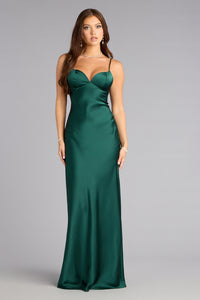 Simple, striking, and made to turn heads. the Winnie formal dress captures classic romance in sleek woven satin, featuring a sweetheart neckline and delicate spaghetti straps. The mermaid silhouette and chiffon-lined finish create that fluid, effortless movement that defines understated elegance.