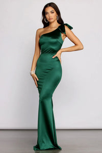 Keep it luxe in the stunning Delana dress that brings the sophistication to your special evening. She features a unique one-shoulder neckline with a charming bow accent on the left shoulder, a floor-length mermaid silhouette, and is composed of a captivating satin-like fabric. Complete your special occasion outfit with rhinestone earrings.