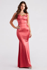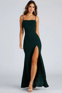 Simple and chic, the Anna formal mermaid dress is perfect for bridesmaids or if you're going to be a guest at an upcoming wedding! She features a sleeveless cowl neckline, adjustable spaghetti straps for a customized fit, a flattering high waist seam, and a floor-length fitted mermaid silhouette with a stylish thigh-high front slit. The crepe fabric offers a moderate stretch. Complete the look in this formal long dress with strappy stiletto heels.