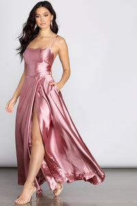 Stun in satin as you create a one-of-a-kind entrance in our Anne dress! She features a sleeveless bodice, a square neckline, padded cups, and spaghetti straps that lead to a lattice back design. Her empire waist leads to a floor-length skirt that is accented with pockets and a stunning waist-high slit. The dress is composed of a satin fabric that offers a relaxed fit with minimal stretch. Includes a back zipper closure. Complete look with a satin clutch and heels.