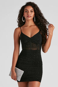 Kerrie Heatstone V-Neck Party Dress Kerrie Heatstone V-Neck Party DressSpecial Occasion Make a magical exit at midnight in the Kerrie party dress for your next dressy night out! She features a sultry sleeveless V-neckline, adjustable spaghetti straps, sheer waist inserts, and a ruched bodycon silhouette to flaunt your fab figure. The dress is composed of a partially lined mesh fabric with all-over iridescent heatstone embellishments. Complete the look in stiletto heels. Fit & Features - Sheer mesh fabric with partial knit lining, plenty of stretch