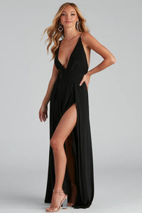 Brie Double Slit A-Line Formal Dress Brie Double Slit A-Line Formal DressBring the romance in the gorgeous sweeping Brie Double Slit A-line Formal Dress! She features a sleeveless bodice with spaghetti straps with a cross-back design, a plunging V-neckline, and sultry thigh-high dual front slits. Pair with a cascading lariat necklace and sparkly heels for a glamorous look for your next elegant evening out. Fit & Features - Spaghetti straps that lead to a cross-back design