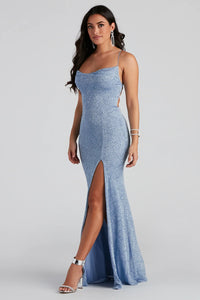 Doria Formal High Slit Glitter Dress Doria Formal High Slit Glitter DressSpecial Occasion Radiate glamour from the moment you enter with a glittery formal dress that brings you into the spotlight. The Doria long dress features a sleeveless cowl neckline, sleek bungee spaghetti straps that cross at the back, lower back cross straps, and an A-line silhouette with a high side slit. The dress is composed of a lurex glitter knit fabric that offers a form-hugging fit with moderate stretch. Complete the look with rhinestone heels. Fit & Features - Sleeveless cowl neckline