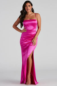 Evie Formal Ruched Satin Sleeveless Dress Evie Formal Ruched Satin Sleeveless DressSpecial Occasion Make an elegant impression with a formal long dress that captivates from the moment you enter the room! Evie features a sleeveless square neckline, adjustable spaghetti straps, ruching at the waist, and an A-line silhouette accented with a high-side slit. The dress is composed of a satin-like fabric that offers a form-hugging fit with a moderate stretch. Complete the look with rhinestone heels and a matching clutch. Fit & Features - Sleeveless square neckline, adjustable spaghetti straps