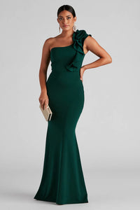 Bring elegance in our charming Diana formal dress! She stuns with her captivating one-shoulder neckline adorned with a ruffled accent and a flattering mermaid silhouette that flares out into her floor-length hem. The dress is composed of a fully lined crepe fabric that offers a moderate stretch. Complete your formal outfit with earrings, heels, and a rhinestone barrette to adorn tresses with.