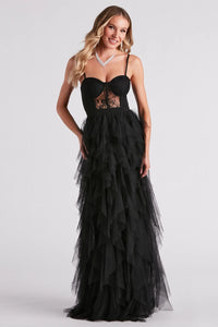 If you have to be fancy soon, the Ruth formal dress exudes romance and drama for every event you're invited to! She makes a grand entrance in her sleeveless sheer lace bustier bodice with a sweetheart neck, adjustable spaghetti straps, non-slip grip lining, built-in padded bust with underwire, and flexible boning inserts. Her a-line silhouette features voluminous tiered ruffles that lead to the floor-length hem. The formal dress is composed of lace and tulle fabric with a stretchy knit lining. Style with fringe earrings and a clutch to complete your dressy look!