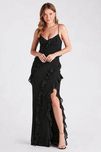 The Gabby formal long dress gives an aurora of dreamy romance with flirty ruffles, a high side slit for movement, and a form-hugging silhouette.