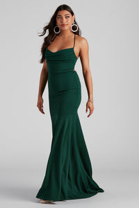 Make a head-turning impression with a formal dress that wows from the moment you enter the room! Meadow features a sleeveless square neckline, spaghetti straps, a daring open back, a fab bow at the lower back that leads to a ruffled trim, and a mermaid silhouette. The dress is composed of a smooth knit fabric that offers a form-hugging fit with a moderate stretch. Complete look with rhinestone heels and a rhinestone clutch.