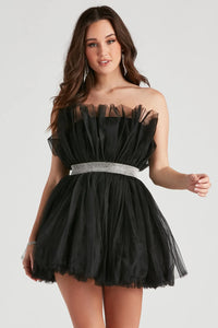 The Katalina sleeveless mesh party dress features a V-neckline with padded bra cups for support, adjustable spaghetti straps for a customized fit, and a voluminous ruffled A-line short silhouette. Perfect for prom or birthdays, pair with platform heels.