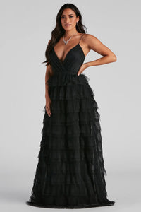 Voluminous tulle in a flirty ruffled tiered style creates the Tyra formal dress to bring the party to banquets, weddings, and dressy cocktail events! She features a sleeveless plunge V-neckline, a pleated bust, adjustable spaghetti straps that crisscross along her open back, and an empire waist that leads to the ruffled tiered A-line silhouette with a long hem. The formal dress is composed of an airy tulle fabric with a stretchy knit lining. Complete the look with a chic tennis bracelet and choker.
