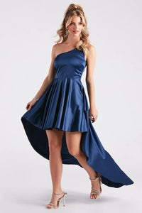 Get ready to stun in the flirty Sky formal satin dress as a wedding guest or for a sweet sixteen! She features a sleeveless one-shoulder neckline, a single tank strap, a lightly padded bust, and a ruffled high-low hem with a gorgeous flowy silhouette. The formal dress is composed of silky satin fabric with a stretchy knit lining. Complete the look with statement earrings and a bracelet.