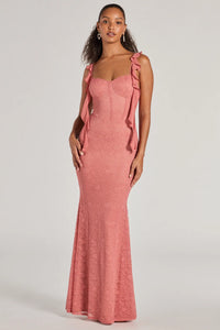 Showcase chic elegance in the Brinley formal mermaid dress crafted with airy sheer chiffon and dainty lace fabrics for an ethereal vibe with a knit lining for coverage. It features a sleeveless ruched sweetheart neckline followed by ruched side panels down the sides, adjustable spaghetti straps for a customized fit, and a floor-length asymmetric mermaid silhouette with a tiered ruffled chiffon hem.