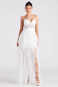 Ashlie Formal Lace Corset Ruffled Dress Ashlie Formal Lace Corset Ruffled DressSpecial Occasion Dial up your inner bombshell in the ravishing Ashlie formal dress to make a dramatic entrance as a sexy bride or a black-tie gala guest! She features a sleeveless sweetheart neckline, adjustable spaghetti straps, a sheer lace corset bodice, and a short skirt lining with a sassy sheer mesh ruffled overlay and a high side slit design to show some skin! Complete the look in this flowy long dress with platform stiletto heels and a necklace. Fit & Features - Sleeveless sweetheart neckline