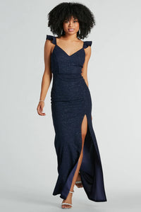 Tamera V-Neck Ruffle Mermaid Glitter Formal Dress Tamera V-Neck Ruffle Mermaid Glitter Formal DressSpecial Occasion Sparkling glitter makes its mark on the Tamera long formal dress destined to be your plus one at prom or black tie weddings! This formal gown adds a touch of glamour to any event in a striking V-neckline that flatters your bust, ruffled spaghetti straps, and a cutout back design that'll have every head turning. Her mermaid silhouette shows off your gorgeous curves while the high front slit gives everyone a peak at your shoes along the floor-length hem. Complete the look with a shimmering clutch purse, block heels, and earrings for a memorable evening style! Fit & Features - Glitter fabric lined with knit
