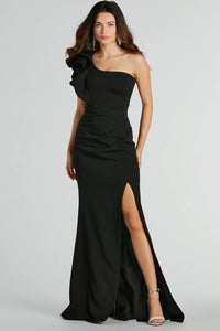 Claudia Ruffled One-Shoulder Crepe Mermaid Dress Claudia Ruffled One-Shoulder Crepe Mermaid DressSpecial Occasion Polished with a little bit of drama! Step out in the Claudia crepe long formal dress to make a fashion scene at black-tie galas and weddings. She showcases a layered ruffled one-shoulder neckline and a side pleated seam that accentuates your curves along the stunning mermaid silhouette. The high front wrap slit adds a touch of sultry, while the floor-length hem and luxurious crepe fabric exude sophistication. Complete the look with statement earrings and an embellished clutch for a chic night! Fit & Features - Crepe fabric with stretch, bust knit lining
