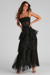 Laura Formal Tiered Tulle Dress Laura Formal Tiered Tulle DressSpecial Occasion Radiate elegance with a formal dress that radiates your timeless style! Laura features a sleeveless square neckline with a pretty tulle trim, adjustable spaghetti straps, and flexible boning that provides structure. Her bodice features a striped illusion design that is partially unlined. Her slim-fit waist leads to a sweeping A-line silhouette with a tiered design. She is composed of a lined tulle fabric that offers a flowy fit with minimal stretch. Complete look with rhinestone heels and a sphere clutch. Fit & Features - Sleeveless square neckline with tulle trim