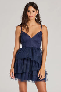 Darling Drama V-Neck Ruffled Tulle Skater Dress Darling Drama V-Neck Ruffled Tulle Skater DressSet your aura to darling drama in this tulle skater dress for graduation parties and rehearsal dinners! The charming V-neckline and delicate adjustable spaghetti straps add a touch of romance, while the tiered ruffled skater silhouette and short-length hem create a playful vibe. Complete the look with a sparkly rhinestone handbag. This dress brings the drama. Want more? Turn up the volume in a showstopping ruffle prom dress or make a statement in our sleek party dresses. Fit & Features - Tulle fabric lined with stretchy knit