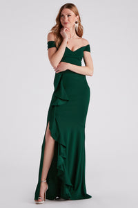 Nayeli Formal Crepe A-Line Long Dress Nayeli Formal Crepe A-Line Long DressSpecial Occasion Dare to stand out in the Nayeli formal dress as a bridesmaid or wedding guest! She features an elegant off-the-shoulder sweetheart neckline, a pleated waist, and an A-line form-hugging long silhouette with a flirty ruffled slit. The formal dress is composed of a lined crepe fabric with a moderate stretch. Style this long dress with a rhinestone clutch and heels to complete the look! Fit & Features - Off-the-shoulder sweetheart neckline