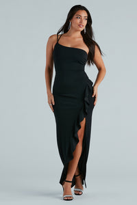 Candace Formal Crepe One-Shoulder Ruffle Dress Candace Formal Crepe One-Shoulder Ruffle DressSpecial Occasion Designed for maximum impact, the Candance formal crepe long dress is the perfect style for bridesmaids or wedding guests! She features a one-shoulder neckline, dual spaghetti straps, an asymmetrical back strap, a curve-hugging slim silhouette, and a front ruffled trim slit and long hem. The formal maxi dress is composed of a slinky crepe knit fabric that offers a chic allure! Complete the look with a bracelet and heels. Fit & Features - Sleeveless one-shoulder neckline