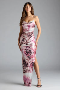 Solada Cowl Neck Slit Floral Satin Formal Dress