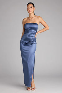 Silky satin meets sculpted structure in the Sofie strapless floor-length gown, designed with flexible boning at the bust for support and a lace-up back for a customizable fit. A high side slit adds just the right amount of drama to every step.