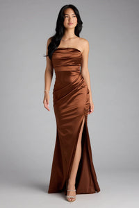 When the invite says formal, but you say unforgettable. The Elani satin strapless dress makes an entrance with a high front slit and a floor-length mermaid silhouette that hugs like a love story.