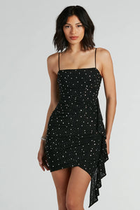 Always charm and bring the party in the Rosalie mini dress to prom or birthdays! Made from a mesh fabric, this dress is embellished with glam details like rhinestones and faux pearls to make you standout. The sweetheart neckline and adjustable spaghetti straps enhance your natural curves, while the built-in padded underwire bust offers support and a flattering silhouette. The bodycon fit and asymmetrical ruffled mini-length hem add a touch of sophistication to this luxurious dress. Complete the look with a clutch and heels.
