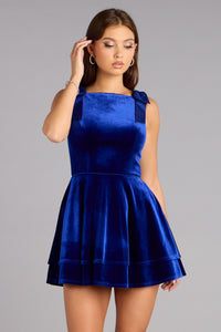 Playful yet polished, the Corrine short dress brings a touch of flirtation to your evening lineup. Crafted from luxe velvet with bow-tied shoulder straps and a softly flared mini skirt, this look moves with you—whether you’re toasting at dinner or twirling on the dance floor.