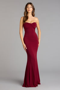 Sleek, chic, and oh-so-flattering, the Kimberly strapless formal dress boasts a trendy tie-back design and mermaid silhouette that accentuates your gorgeous curves!