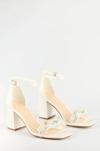 Show off a chic stride in these oh-so-glam block heels featuring a toe strap with a rhinestone and faux pearl twisted design.