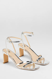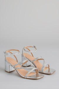 Show up and show out in these sleek metallic block heels with a glamorous glow. Designed with an open square toe and asymmetric straps, style with a rhinestone clutch.
