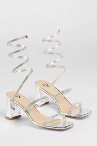 Show up to your special occasion with fancy feet! These chrome stiletto heels are perfect for achieving a glam look. They feature an almond toe and rhinestone spiral straps. Complete the look with a matching clutch.