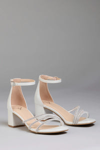 Ultra-luxe rhinestones embellish the asymmetrical toe straps on these chic short block heels perfect for brides, birthday babes, or dressy events! Pair with a clutch.