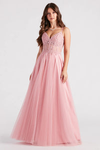 Have a fairytale moment in the enchanting Jaci rhinestone embroidered mesh formal dress! She features a sleeveless sweetheart neckline with a lined and padded bust, adjustable spaghetti straps, a sheer corset-designed bodice with floral embroidered applique and radiant rhinestone embellishments, a fitted high waist, and a floor-sweeping hem with a flowy A-line silhouette. The airy sheer mesh fabric includes a woven skirt lining. Complete your regal look with a rhinestone jewelry set.
