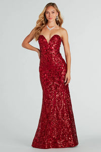 Enchant everyone's evening when you arrive in the Leighton formal sequin long dress! She evokes classy sultriness in a strapless sweetheart neckline with a wired notch cutout, a padded bust, and a mermaid silhouette that hugs your curves down to her dramatic bonded floor-length hem to create a voluminous effect. The formal long dress is embellished with sparkling sequins in a regal scroll pattern on mesh fabric and has a full stretchy knit lining. Complete the look in teardrop earrings for a black tie gala or party!
