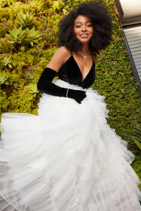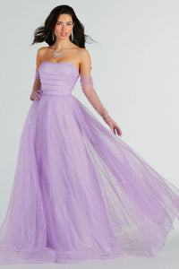 Designed with sparkly glitter polka dots and a full skirt made for twirling, the Brie tulle ball gown brings next-level shine to prom, birthday celebrations, and balls! Crafted from a glitter polka dot tulle fabric with a full stretchy knit lining for a delicate and elegant touch to this stunning gown. Her strapless neckline, ruched bodice, and A-line silhouette create a flattering fit, while the flexible boning offers support and is complemented by the detached sheer gloves. The bonded floor-length hem adds a touch of glamour and volume to this mesmerizing gown. Complete the look with an elegant necklace and earrings set.