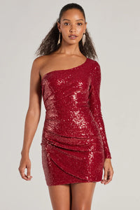 Shimmer and shine like a star in the Sandra sequin mini dress designed with a sultry one-shoulder neckline and a ruched wrap bodycon silhouette that gives the appearance of an hourglass figure. Complete the look with earrings and heels.