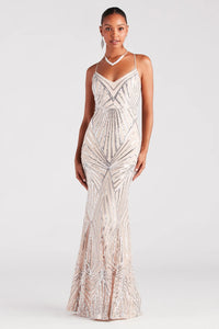 Create an enchanting entrance in the gorgeous Angelina formal sequin mermaid dress that will take everyone's breath away. She features a sleeveless V-neckline, spaghetti straps that lead to an open back with a cross-back lace-up strappy design, a floor-length hem, and a form-hugging mermaid silhouette. The lined mesh fabric features stunning sequin embroidery in an intricate geometric pattern. Complete your look in this long dress for a black-tie gala with stiletto heels.