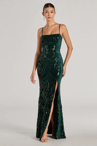 Radiate a glamorous aura in the Meara formal column dress crafted with luxe velvet fabric and all-over sequin embroidery in a chic abstract pattern. It features a sleeveless sweetheart neckline, tie-back halter straps leading to a partially open back, and a high-cut front slit to accent the floor-length column silhouette.