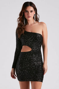 Sparkle your way into the party wearing this sequin mini dress! The short dress features a one shoulder, long sleeve design, waist cut out, bodycon silhouette, and a side zipper closure. Complete the look with chic hoops and booties.