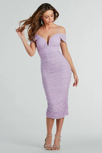 Anika Cold-Shoulder Pearl Mesh Formal Midi Dress