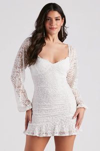 Enchant with your loveliness in this lace mini dress for bridal showers or celebrations! It features sheer peasant long sleeves, a sweetheart neck, a lightly padded bust, a form-hugging fit, and a flirty front ruched seam leading to the ruffled hem. Complete the look in sassy-heeled sandals.