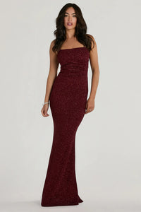 Look your best for a fancy night in the stunning Amirah formal glitter dress! Fashioned with an eye-catching cross back, this dress will make you feel like the star of the evening with a high slit and floor-length column silhouette.